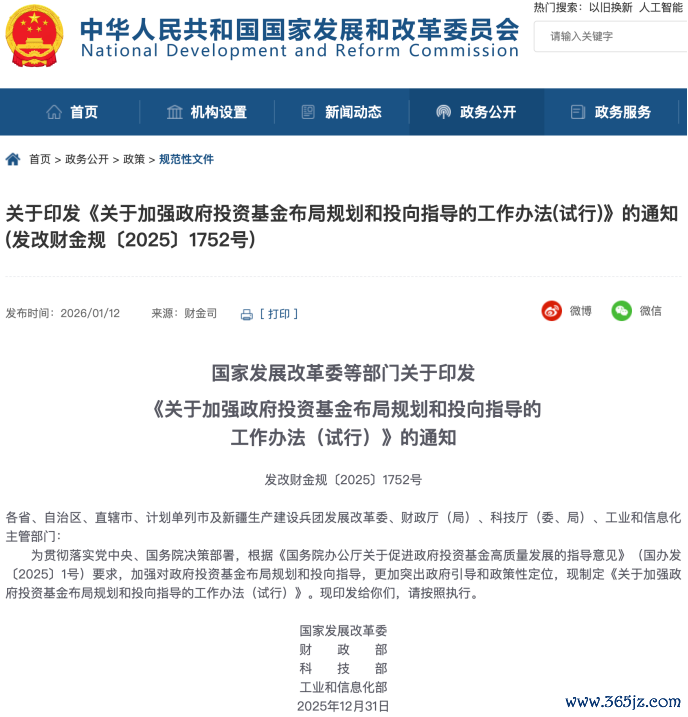 1月12日,国家发展改革委、财政部、科技部、工业和信息化部联合发布《关于加强政府投资基金布局规划和投向指导的工作办法》(以下简称《工作办法》)。国家发展改革委相关负责人表示,这是首次在国家层面对政府投资基金的布局和投向作出系统规范。