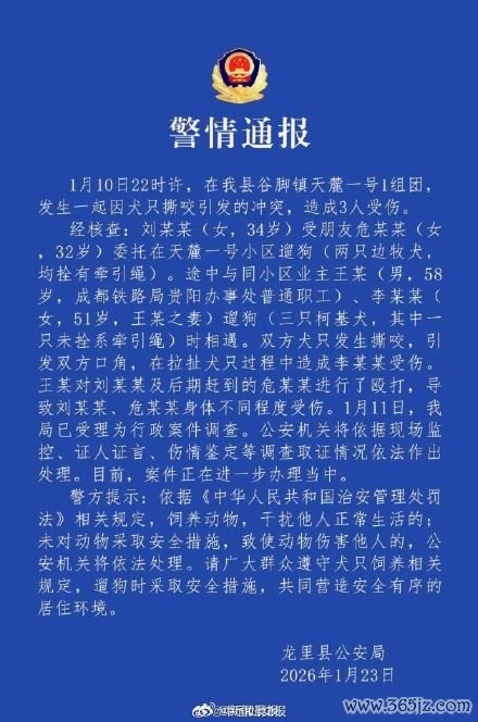 1月23日,贵州龙里县公安局发布通报:1月10日22时许,在我县谷脚镇天麓一号1组团,发生一起因犬只撕咬引发的冲突,造成3人受伤。 经核查:刘某某(女钱龙配资,34岁)受朋友危某某(女,32岁)委托在天麓一号小区遛狗(两只边牧犬,均栓有牵引绳)。途中与同小区业主王某(男,58岁,成都铁路局贵阳办事处普通职工),李某某(女,51岁,王某之妻)遛狗(三只柯基犬,其中一只未栓系牵引绳)时相遇。双方犬只发生撕咬,引发双方口角。在拉扯犬只过程中造成李某某受伤。王某对刘某某及后期赶到的危某某进行了殴打,导致刘某某、危某某身体不同程度受伤。1月11日,我局已受理为行政案件调查。公安机关将依据现场监控、证人证言、伤情鉴定等调查取证情况依法作出处理。目前,案件正在进一步办理当中。
